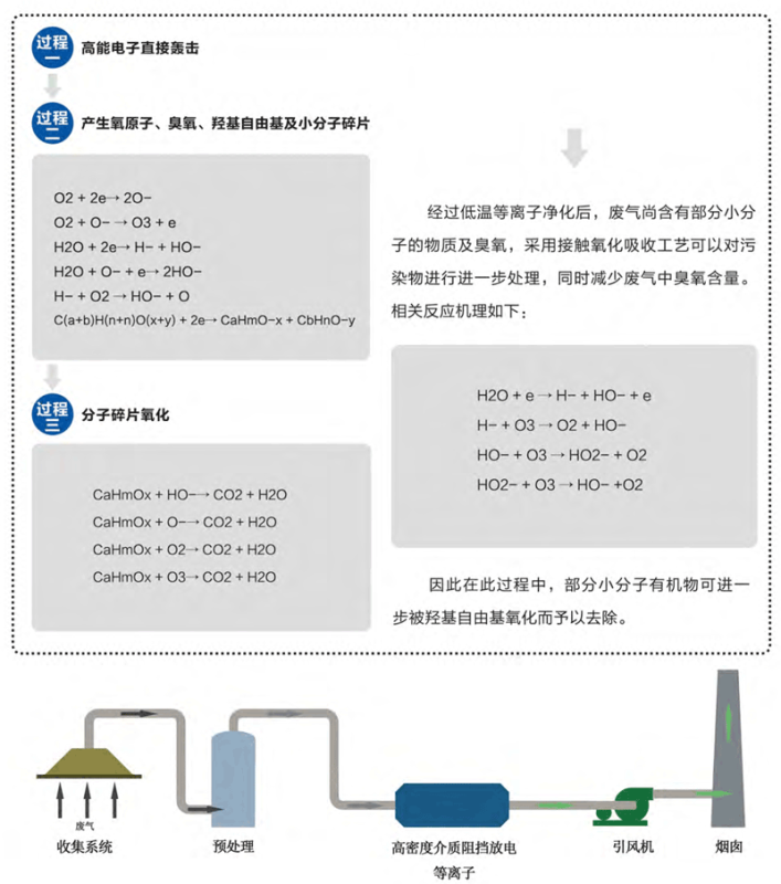在外加電場(chǎng)的作用下,介質(zhì)放電產(chǎn)生的大量攜能電子轟擊污染物分子,使其電離、解離和激發(fā),然后引發(fā)了一系列物理、化學(xué)反應(yīng),是大分子污染物轉(zhuǎn)變?yōu)楹?jiǎn)單小分子安全物質(zhì),或使有毒物質(zhì)轉(zhuǎn)變?yōu)闊o(wú)毒無(wú)害或低害低毒物質(zhì),從而使污染物異味得以降解去除。因其電離后產(chǎn)生的電子平均能量在1eV~10eV,適當(dāng)控制反應(yīng)條件可以實(shí)現(xiàn)一般情況下難以實(shí)現(xiàn)或速度很慢的反應(yīng)變得十分快速。